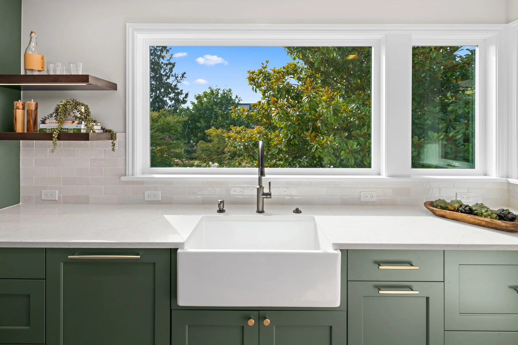 Beginning with the kitchen, we optimized storage with full-height cabinets and added windows to unveil breathtaking mountain views. Additional countertop space facilitates effortless meal preparation, while an expanded entryway fosters an open concept flow into the dining room. Sherwin Williams 6187 Rosemary shaker cabinets introduce a bold pop of color, alongside a custom decorative hood vent that serves as a striking focal point. The new apron front sink is warm and welcoming, while bronze and brass finishes exude vibrance and elegance. The 30” Bertazzoni gas range—chic and airy—provides a premium commercial experience.